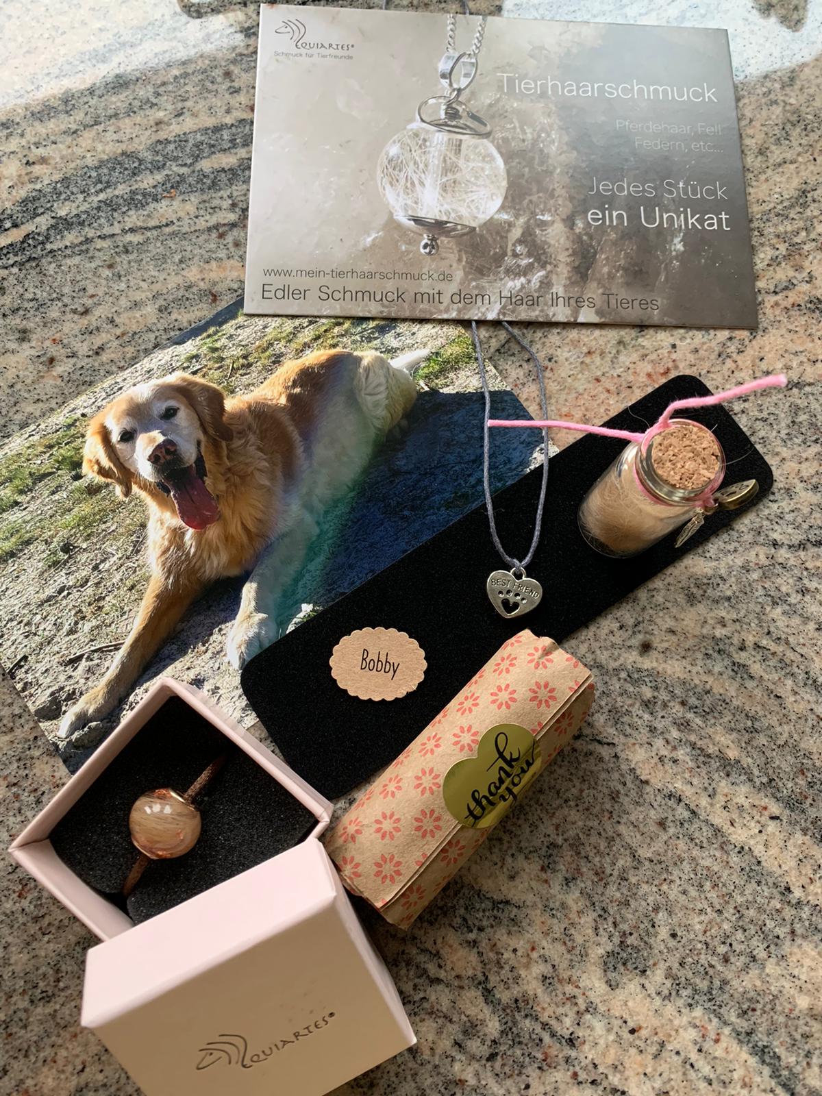 Sie war unser erster Familienhund und ich wollte ein schönes Andenken an sie haben. Die Kugel für mein Armband mit ihren Haaren ist unglaublich schön geworden. Das Schmuckstück ist war sehr liebevoll verpackt. Sogar die restlichen Haaren wurden liebevoll in eine Tüte verpackt. Ich habe es leider nicht geschafft gehabt die besten Haare rauszusuchen und somit die Haare in der Medikamentenpapiertüte vom Tierarzt abgeschickt und hatte deswegen schon ein schlechtes Gewissen. Zurück kamen diese in einer Klarsichttüte mit Sternchen und auf einem schönen Aufkleber und Anhänger zurück. Es wird somit nicht nur Liebe in die Details gesteckt sondern auch ganz viel Empathie.