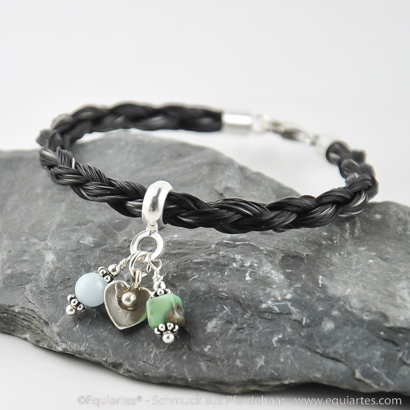 In der Mitte des Armbandes befindet sich ein Charm Anhänger mit drei dekorativen Perlen: echter Türkis, Süßwasser Perle und Rosenquarz. Weitere Kombinationen stehen zur Auswahl. Dieses Schweifhaararmband können Sie individuell gestalten, der Charmträger bietet genug Platz um auch noch einen eigenen Anhänger anzubringen.