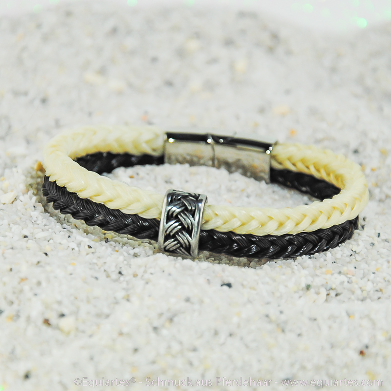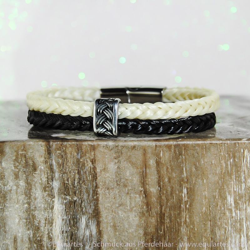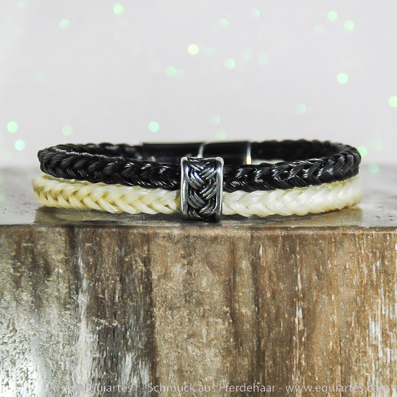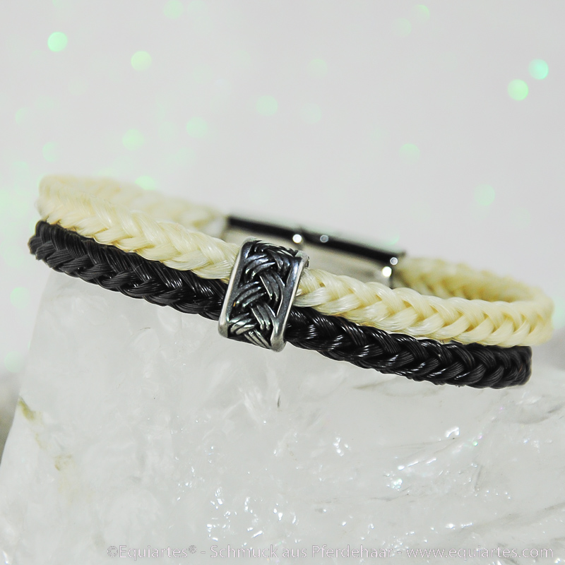 Auch bei diesem schönen Armband werden zwei square (vierkant) Flechtteile nebeneinander gelegt und mit einem Slider fixiert. Die beiden Flechtteile werden jeweils aus 8 etwas dickeren Haarsträhnen geflochten. Das gibt dem fertigen Schmuckstück ein etwas robusteres Aussehen. Der Edelstahlslider bildet ebenso einen geflochtenen Strang ab was eine schöne, sinnige Ergänzung zum geflochteten Pferdehaar darstellt. Zusätzlich sorgt er für Stabilität und hält die beiden Pferdehaar Flechtteile zusammen.