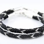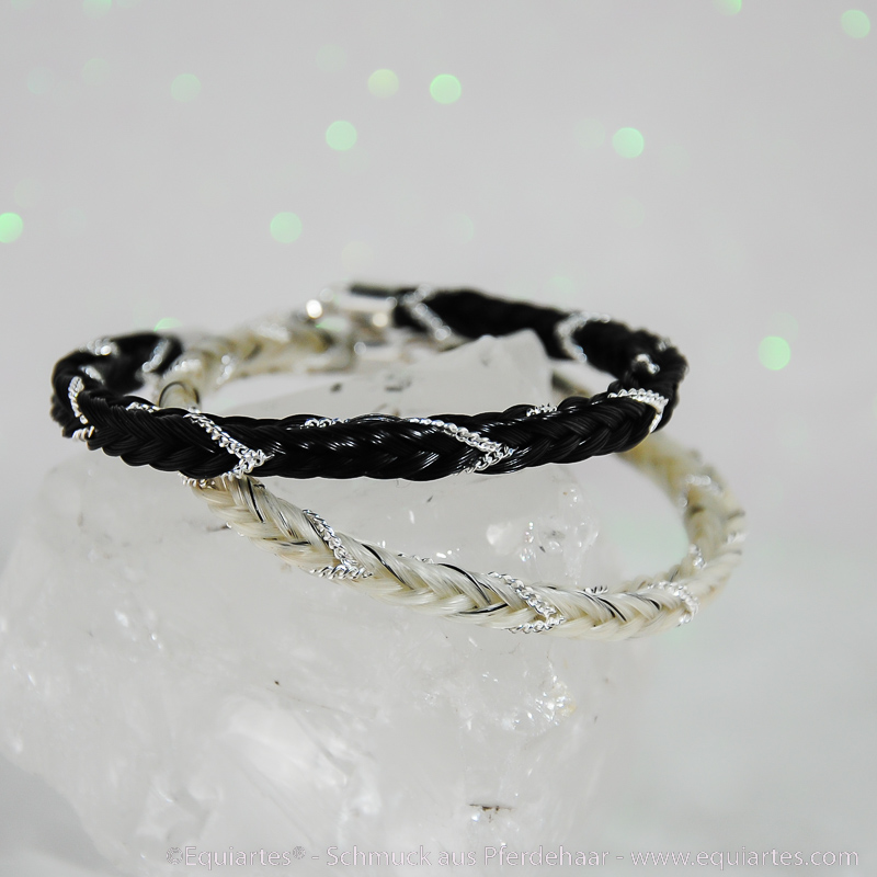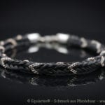 Eines unserer absoluten Lieblingsmodelle ist das sehr aufwändig gearbeitete Armband Silberschweif. Zwei der insgesamt 12 Stränge werden durch echte 925 Silberketten ersetzt wodurch ein pfeilartiges Muster entsteht. Durch die Flechtart SQUARE erhält das Schmuckstück eine Vierkantform mit eleganter Wirkung. In dunklem Pferdehaar kommt das Silbermuster besonders gut zur Geltung.