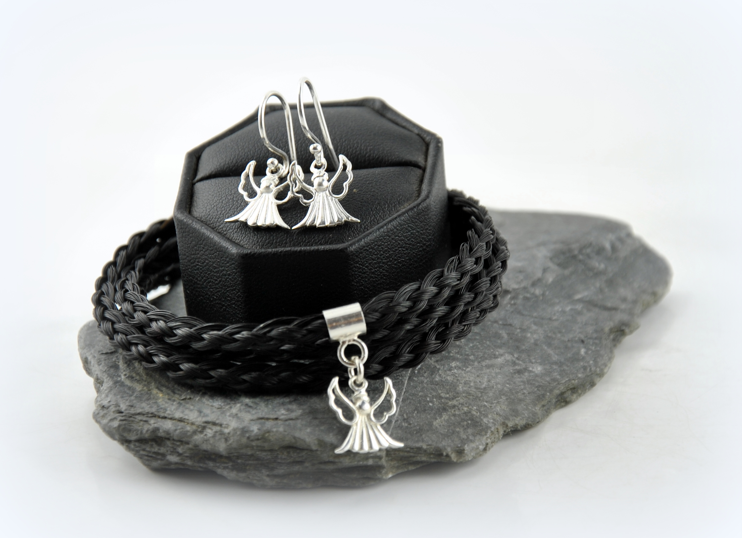 Halbrund geflochtenes Wickel-Armband aus Pferdehaar mit einem zierlichen Engel-Charm-Anhänger in der Mitte.
